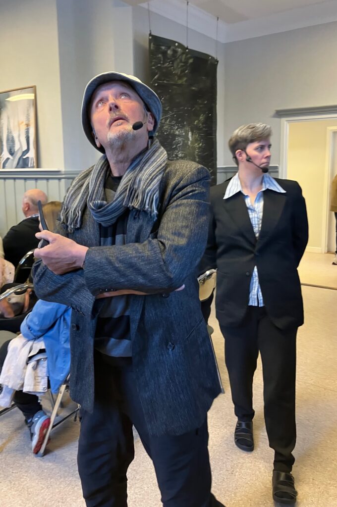 På lördagens berättarcafé fick publiken först ta del av Jörnsrevyns ”Halv åtta hos Sara Lidman”, en kulinarisk upplevelse hemma hos Sara med två av Västerbottens författare som gäster.
